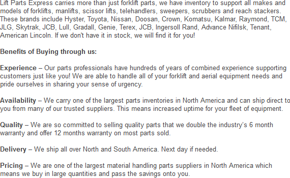 We have great prices on all our lift-truck parts. Give us a phone call today if you are interested in getting a price estimate on our attachments or parts. Our number is: